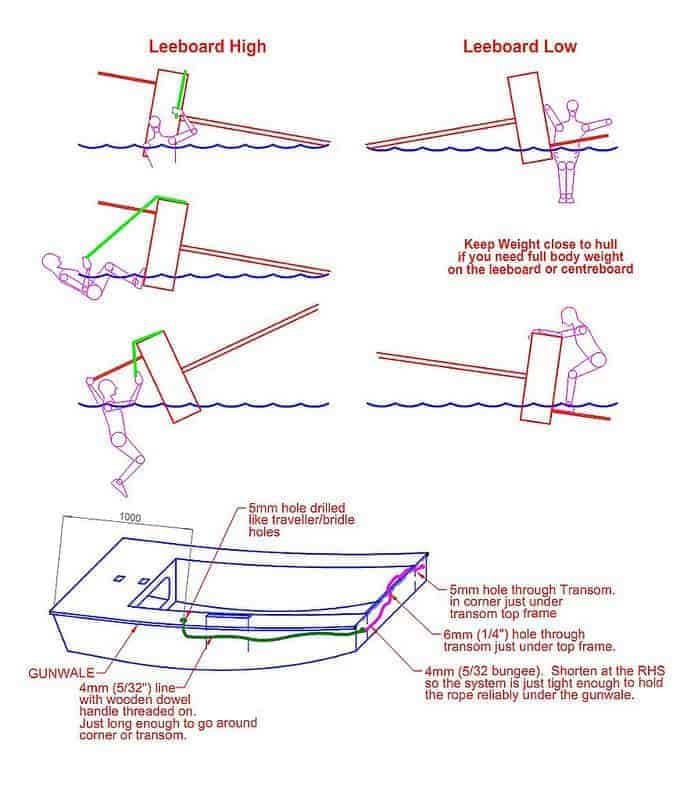 A problem with a single leeboard is after a capsize there is a 50% chance of it being out of reach. Here is a method of setting up a rope to help right PDRacers and OzRacers when the leeboard is out of reach. The nice thing about the OZ series is that all the boats come up with very little water inside when righted from capsize. Also the wooden mast doesn’t allow the boat to turn completely upside down.