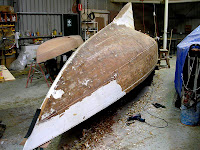 Keel is off – boat is upside down – hull is half stripped and half splined – starboard side. I’m assisting with the technical side. If the end result is as nice as the work Duck Flat and I did on our last keelboat restoration – “the orange boat” – that would be a happy outcome.